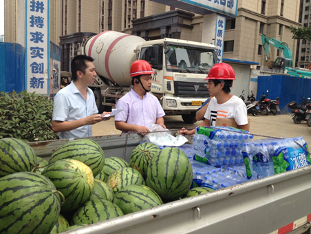 2015年8月6日,公司人力資源與行政管理部專員及質(zhì)量安全部經(jīng)理丁益民組成高溫慰問組,代表集團(tuán)公司開展對夏季各項(xiàng)目施工隊(duì)“送清涼”活動(dòng),對冒著酷暑高溫持續(xù)施工的一線人員表示慰問與感謝。