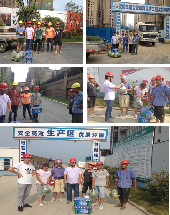 城市的一磚一瓦、一草一木都承載著建筑工人們在烈日下的每一滴汗水,沐霞趁露出,披星戴月歸,為此,慰問組冒著三十六七度的高溫,滿載著西瓜、礦泉水、藿香正氣藥水等防暑降溫物品趕赴項(xiàng)目施工現(xiàn)場,詳細(xì)詢問防暑降溫措施,質(zhì)量安全部經(jīng)理再三強(qiáng)調(diào),要確保工地現(xiàn)場安全施工,防止高溫中暑,做到防范到位,并反復(fù)叮囑各項(xiàng)目負(fù)責(zé)人要合理安排作業(yè)時(shí)間,按照有關(guān)規(guī)定適當(dāng)調(diào)整工作班次和工作時(shí)間,盡量避免中午高溫作業(yè)時(shí)間,配備好安全生產(chǎn)和職業(yè)防護(hù)勞動(dòng)用品及措施,在確保人員安全的前提下,保證施工生產(chǎn)正常進(jìn)行。同時(shí)加強(qiáng)對職工防暑安全知識的宣傳教育,注意飲食衛(wèi)生,及時(shí)消除事故隱患,切實(shí)搞好夏季安全生產(chǎn)。