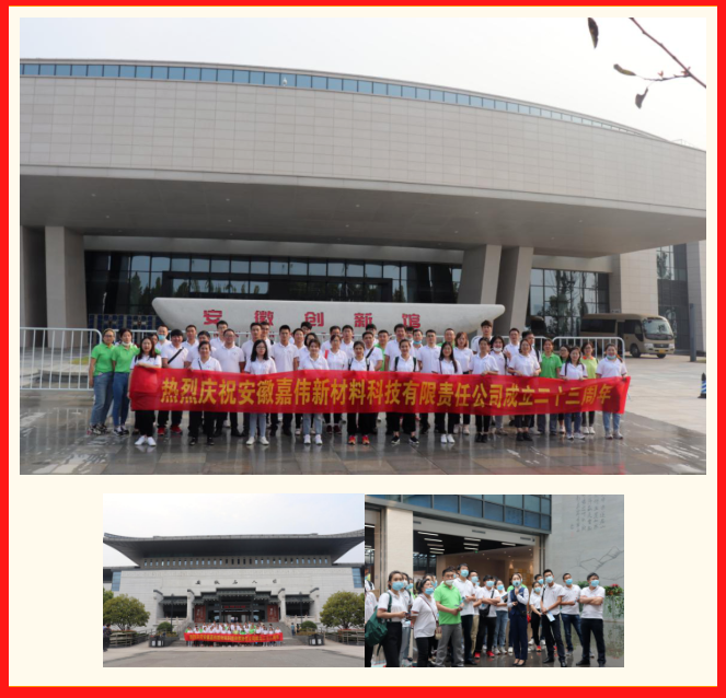 歲月如歌,二十三年彈指一揮間,安徽嘉偉新材料科技有限責(zé)任公司(以下簡(jiǎn)稱安徽嘉偉)迎來了二十三周年的生日。為慶祝安徽嘉偉成立二十三周年,2020年9月26日,公司組織員工赴合肥濱湖濕地森林公園、合肥渡江戰(zhàn)役紀(jì)念館、安徽名人館、安徽創(chuàng)新館開展了團(tuán)建拓展活動(dòng)。