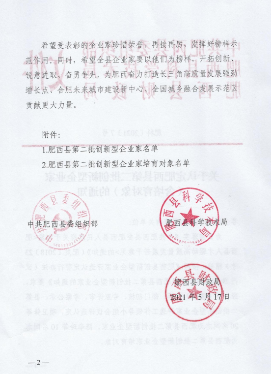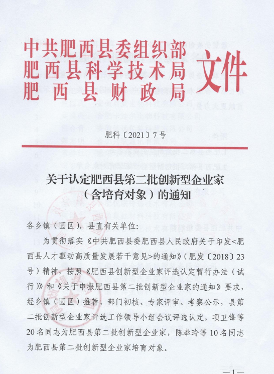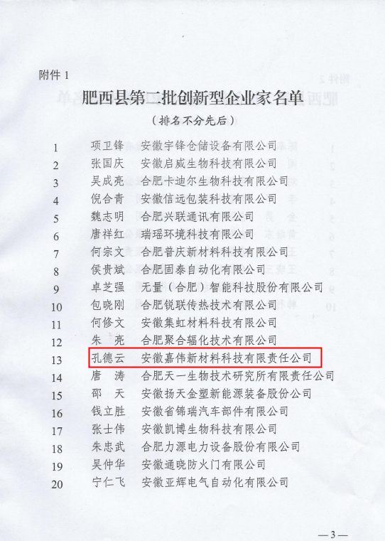根據《中共肥西縣委肥西縣人民政府關于印發(fā)<肥西縣人才驅動高質量發(fā)展若干意見>的通知》以及相關實施細則、評審辦法等文件規(guī)定,經鄉(xiāng)鎮(zhèn)(園區(qū))推薦、部門初核、專家評審、考察公示等程序,安徽嘉偉新材料科技有限責任公司董事長孔德云先生成功當選肥西縣創(chuàng)新型企業(yè)家。